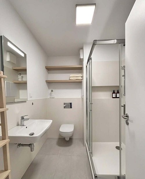 kúpeľňa so sprchovým kútom a WC