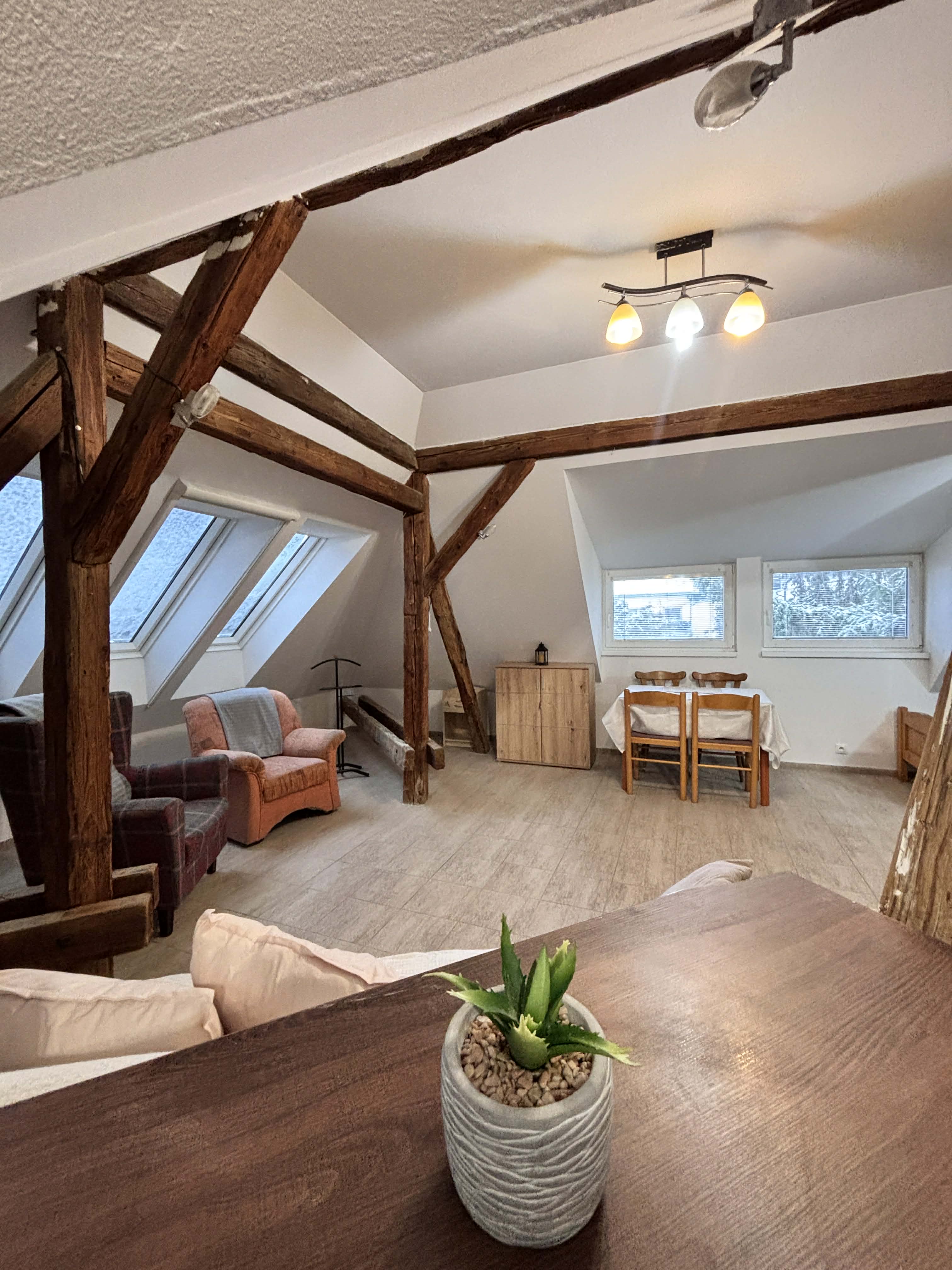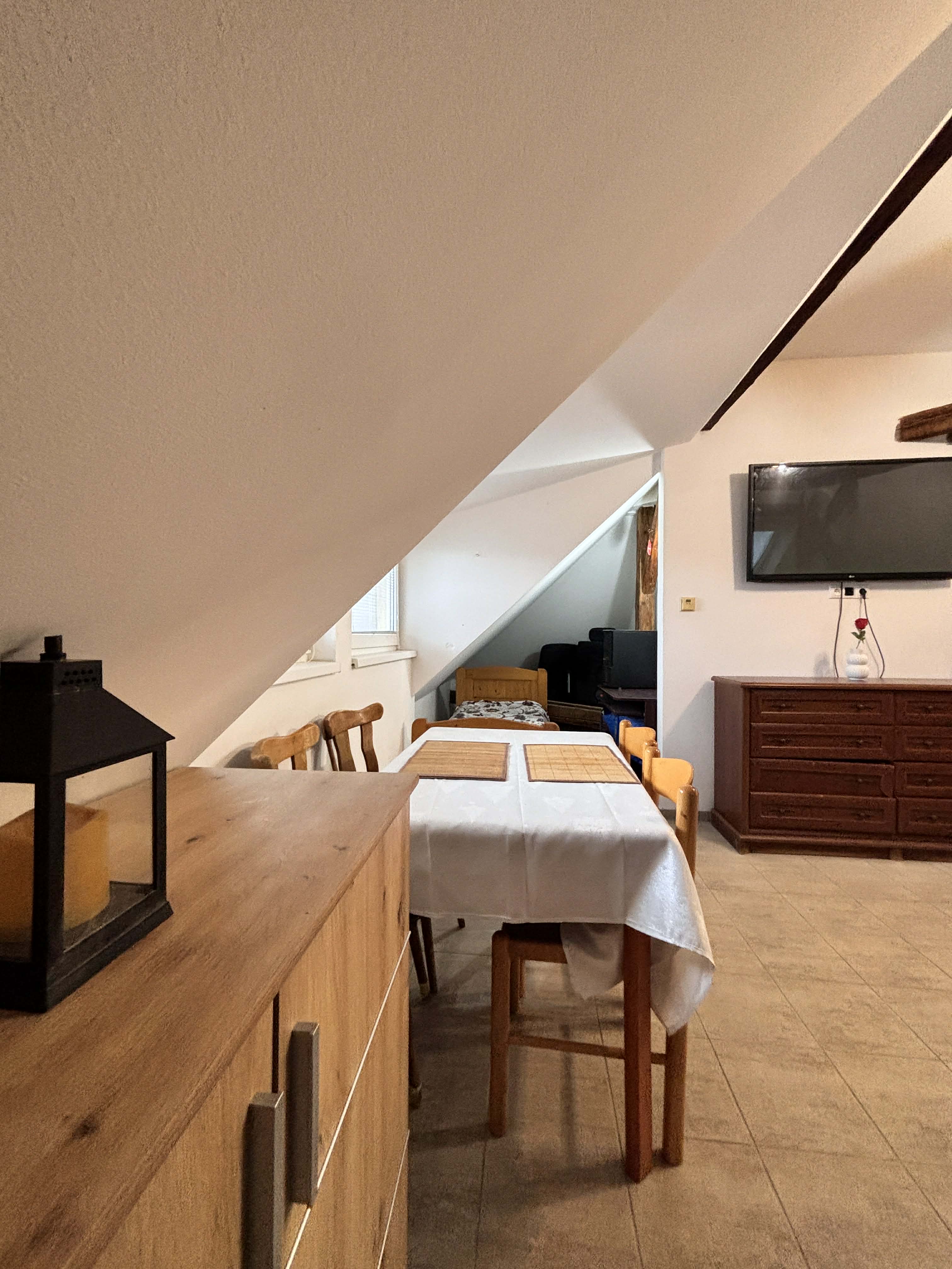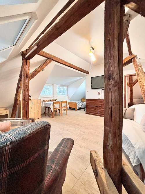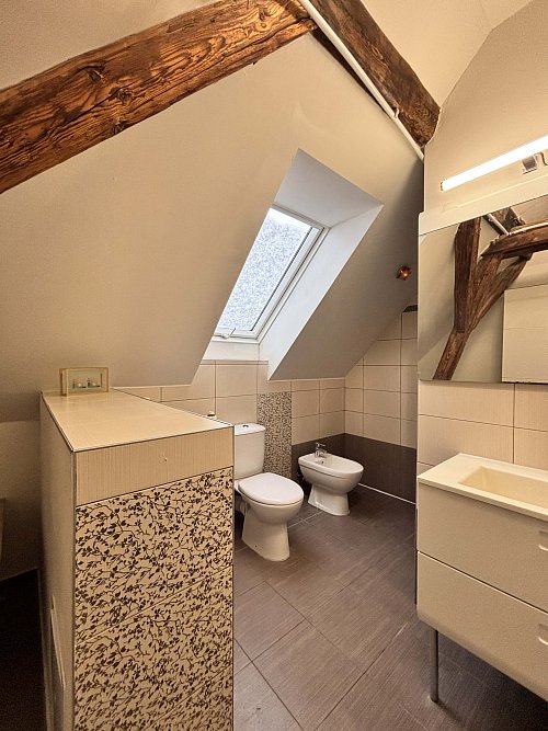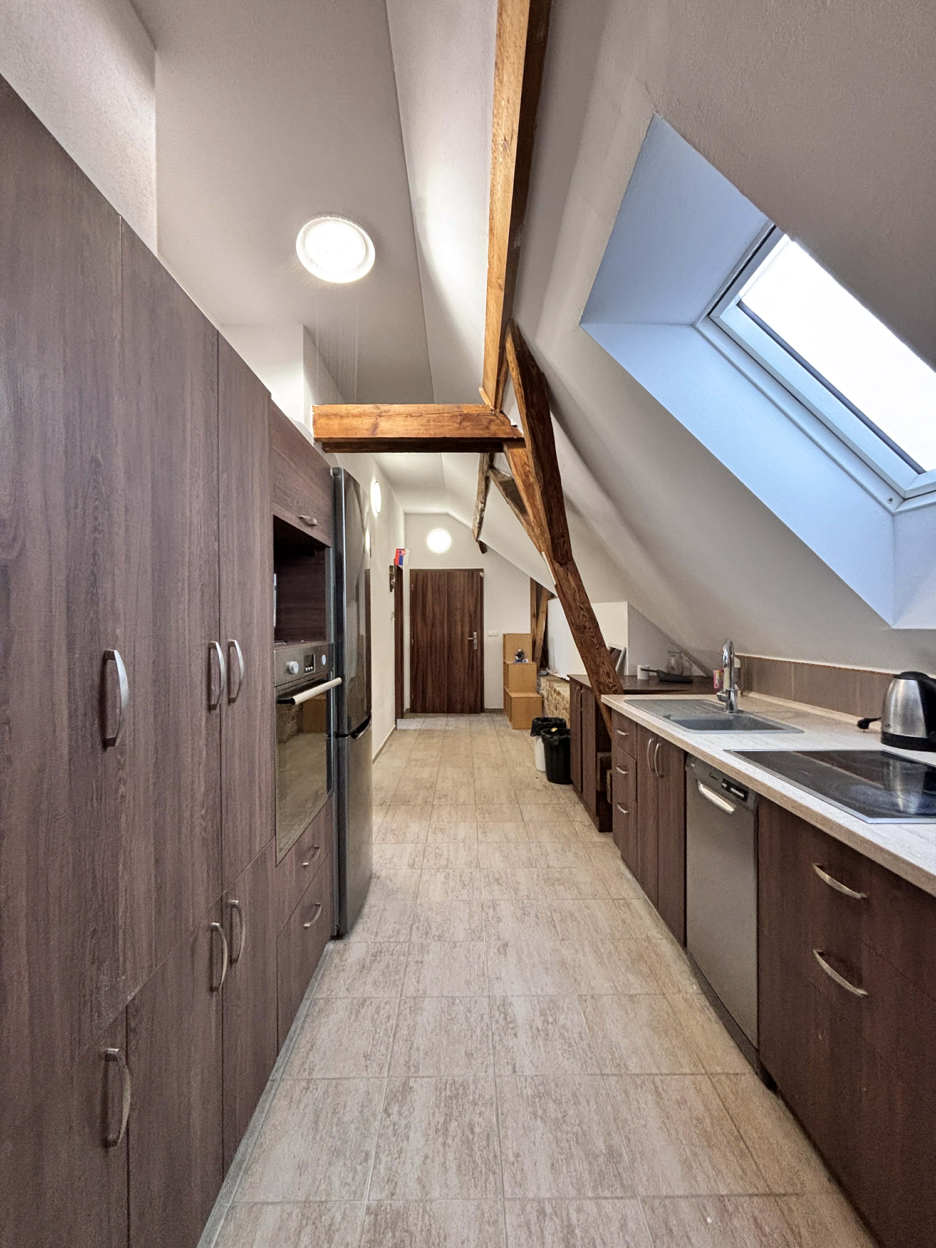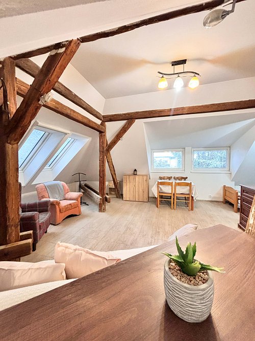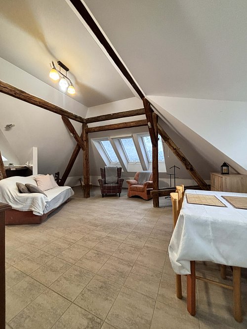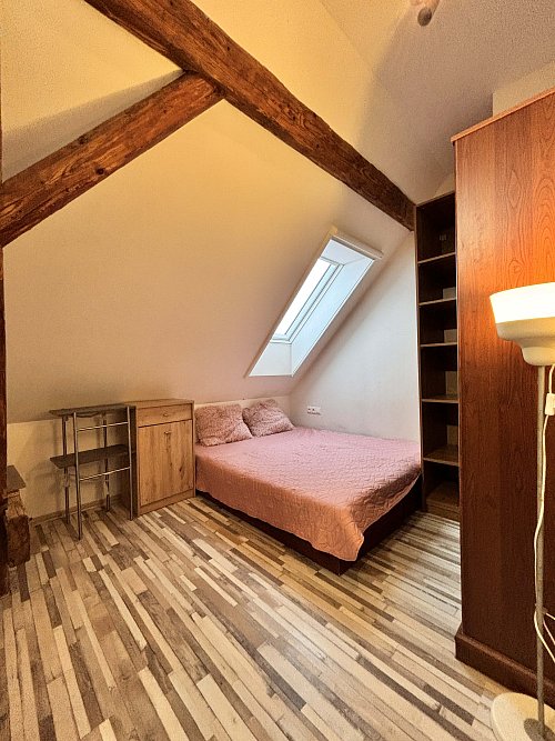 Ponúkame na prenájom veľký 3-izbový byt o výmere cca 90 m², ktorý sa nachádza na Svätoplukovej ulici v Senci, v podkroví rodinného domu s tromi bytovými jednotkami.